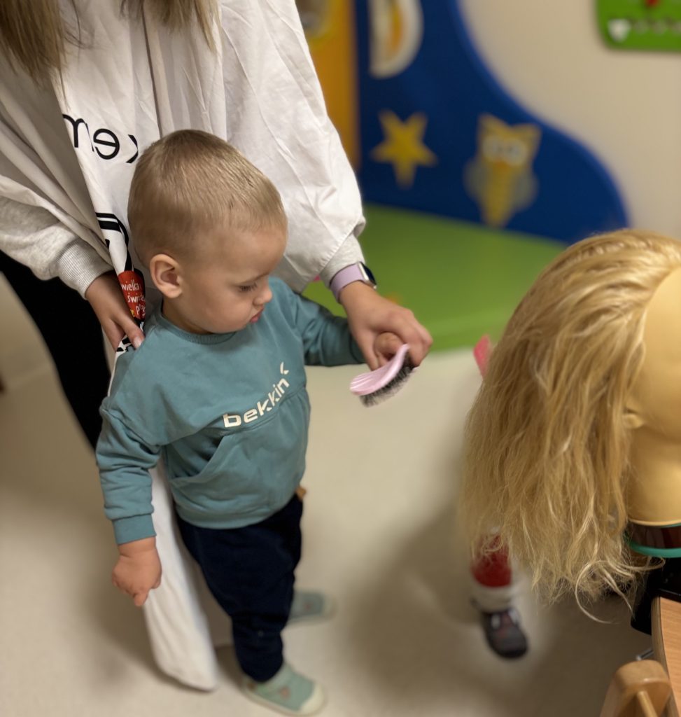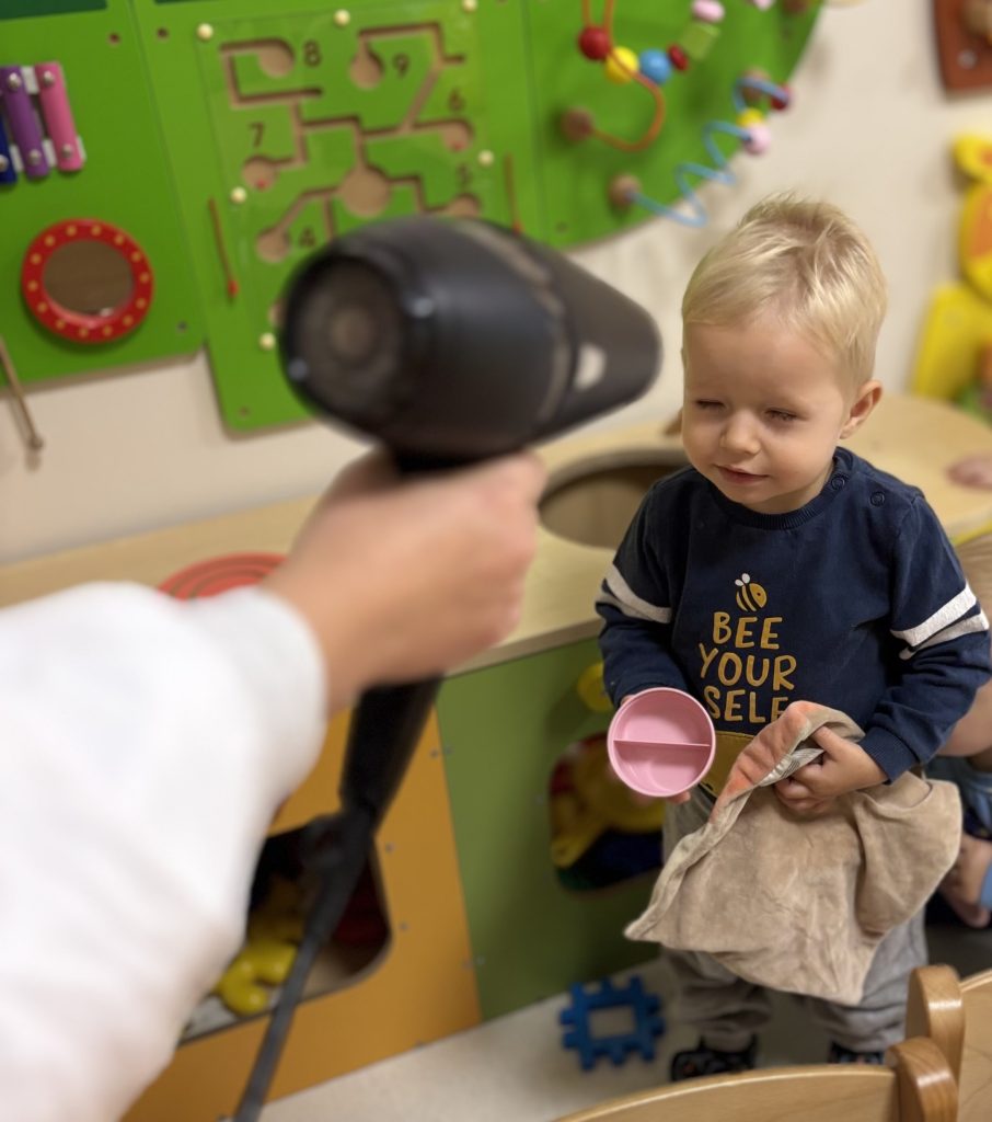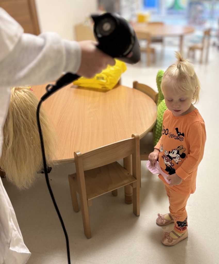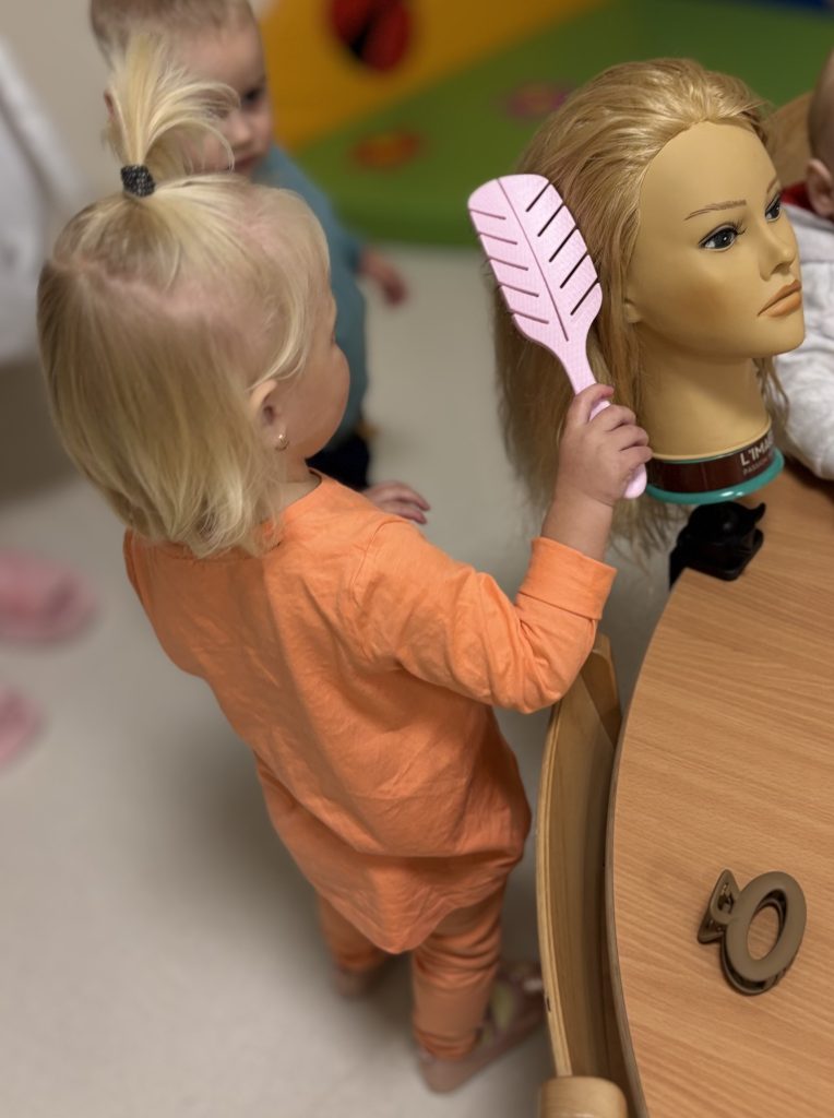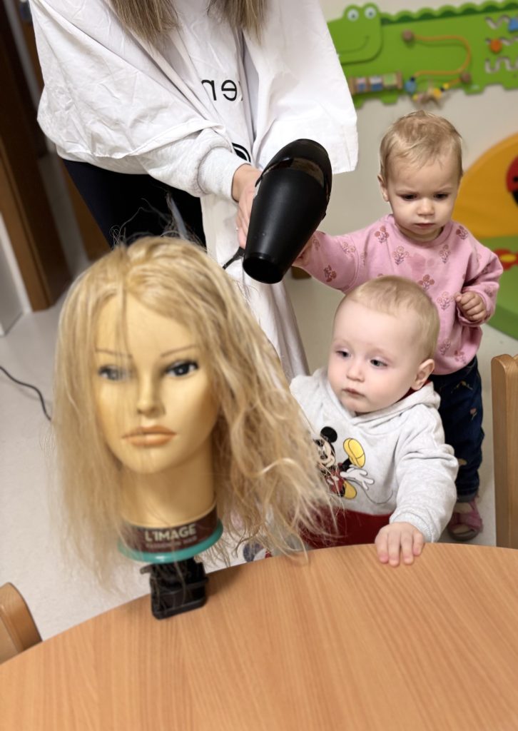 Dzieci dowiedziały się, na czym polega zawód fryzjera. Czesaliśmy główkę fryzjerską, suszyliśmy włosy, a potem sami zakładaliśmy fartuszki i bawiliśmy się w salon fryzjerski.