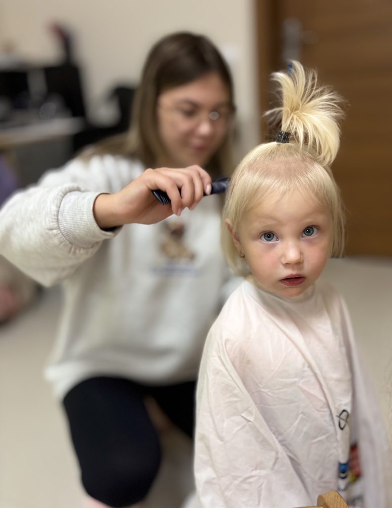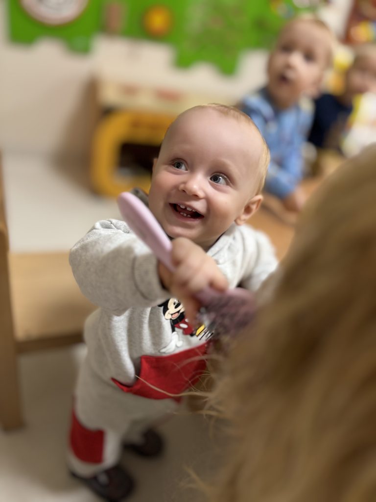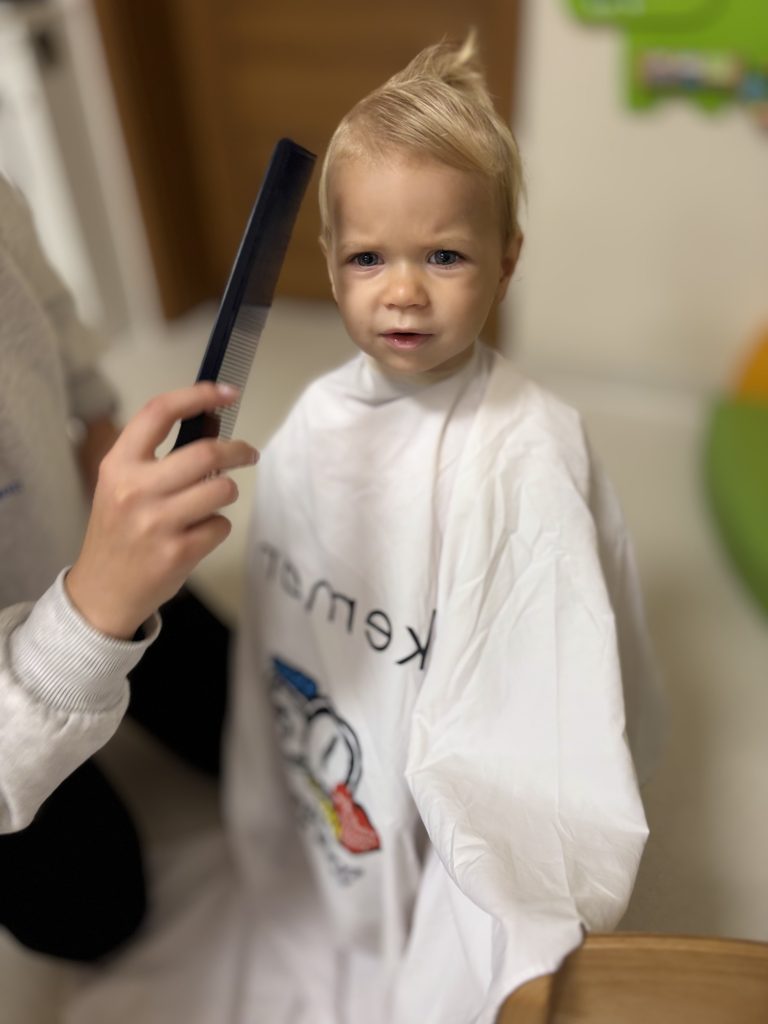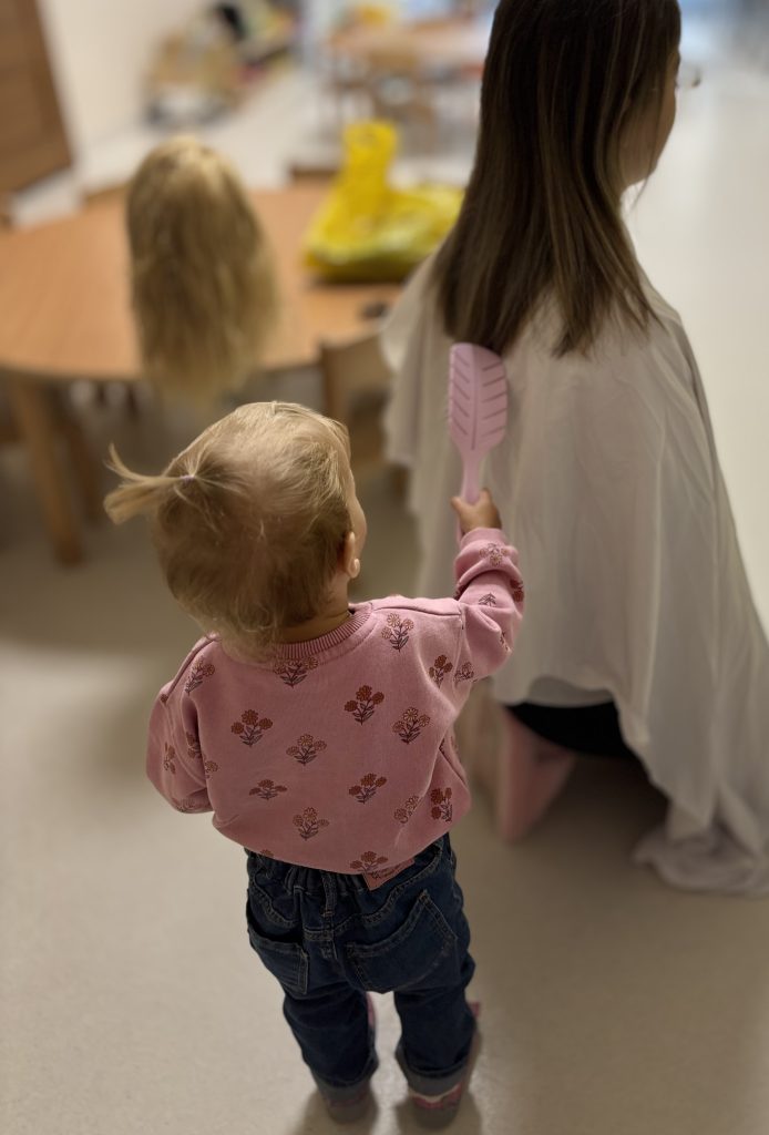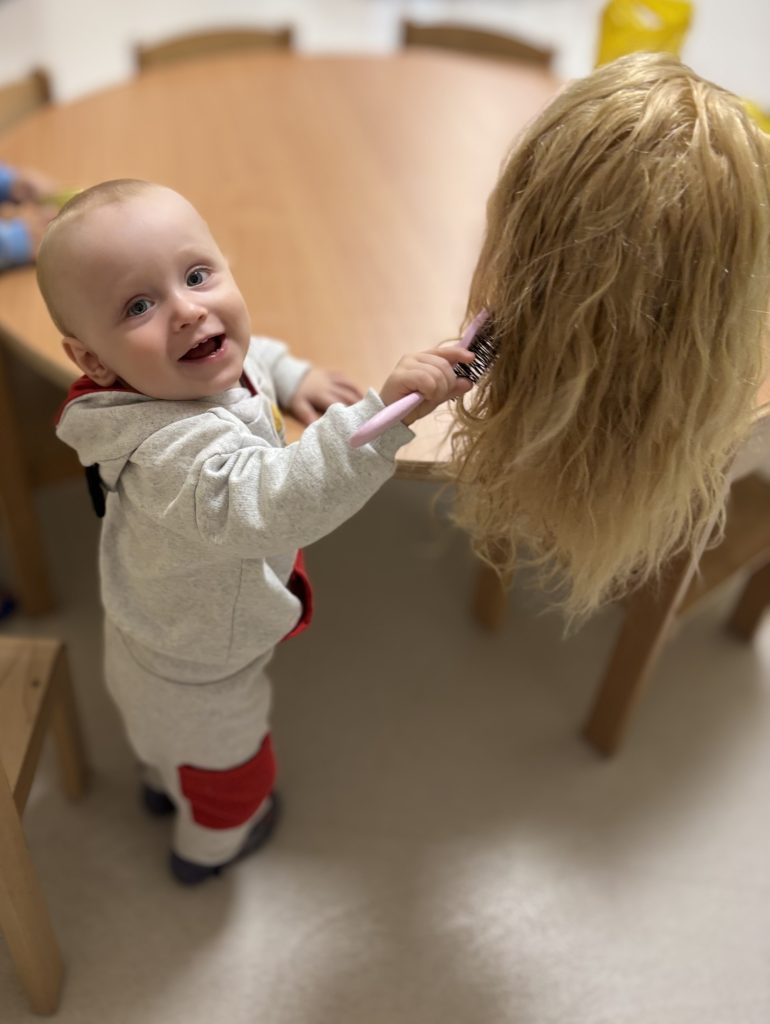 Dzieci dowiedziały się, na czym polega zawód fryzjera. Czesaliśmy główkę fryzjerską, suszyliśmy włosy, a potem sami zakładaliśmy fartuszki i bawiliśmy się w salon fryzjerski.