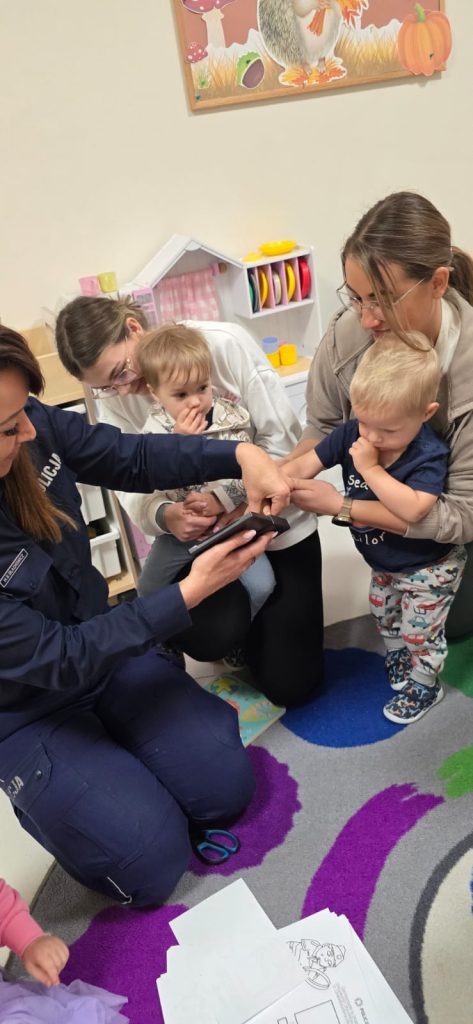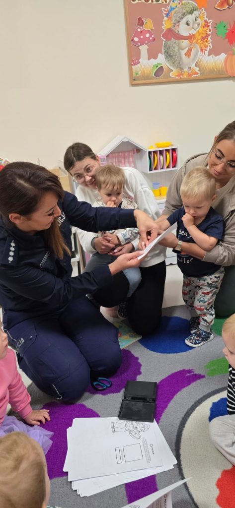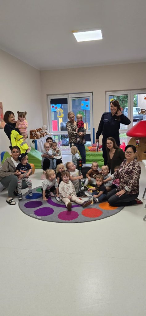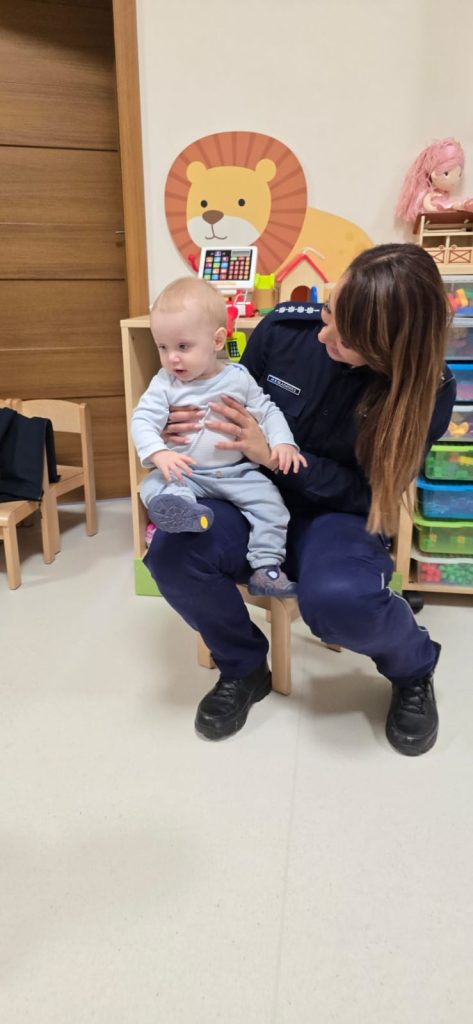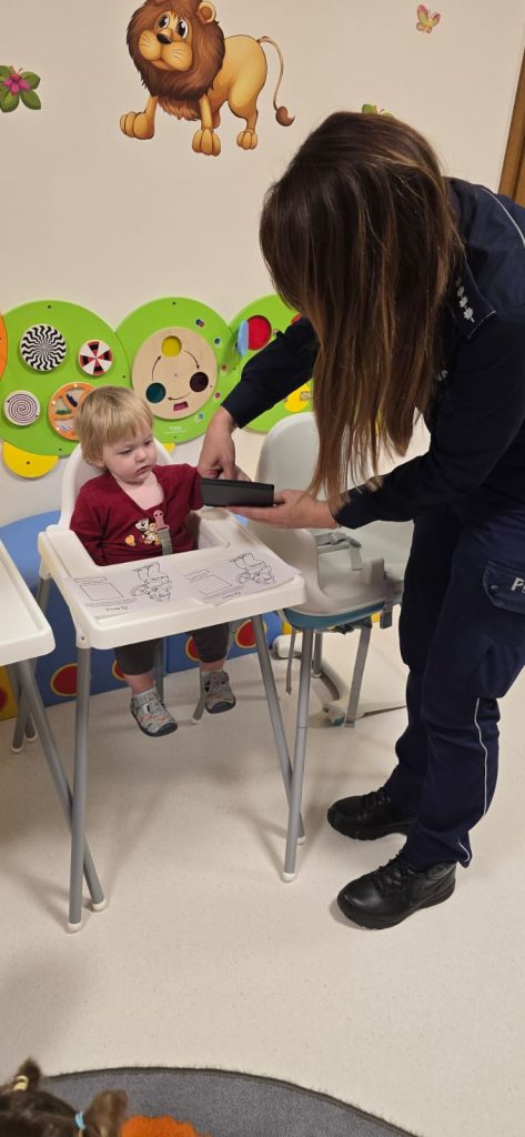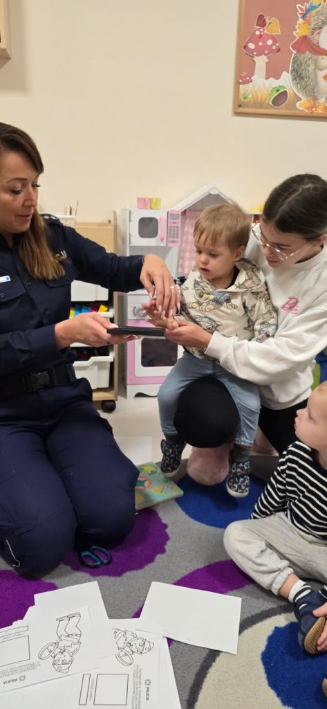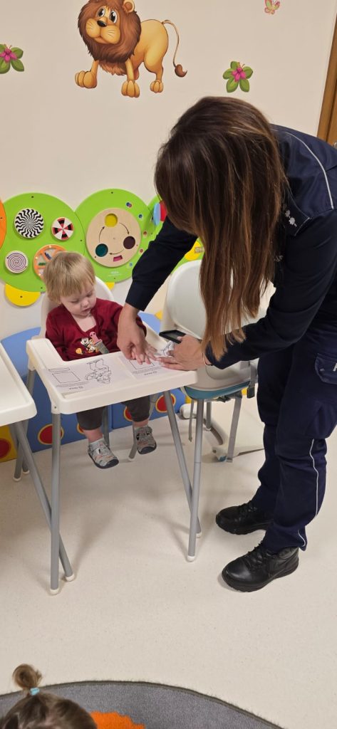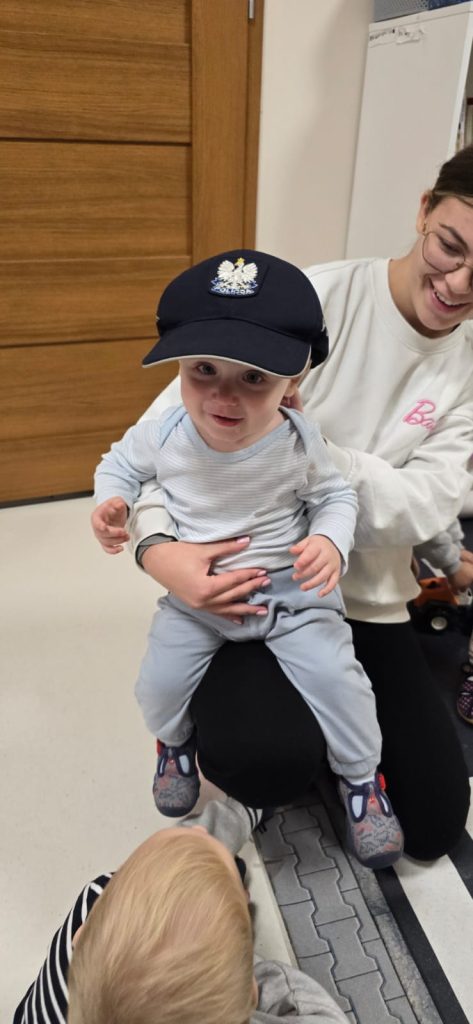 Dziś w naszym żłobku odbyło się spotkanie dzieci z Paniami Policjantkami z Komendy Policji w Aleksandrowie Kujawskim. Celem wizyty było przypomnienie podstawowych zasad bezpieczeństwa, Pani policjantka przybliżyła dzieciom podstawowe zasady bezpiecznego poruszania się po drogach. Jak zwykle dużym zainteresowaniem cieszyła się prezentacja wyposażenia policyjnego, niezbędnego podczas wykonywania pracy policjanta. Na karteczkach każdy z osobna odbił swój odcisk palca. Wspólne zdjęcie było zwieńczeniem tej niecodziennej wizyty.