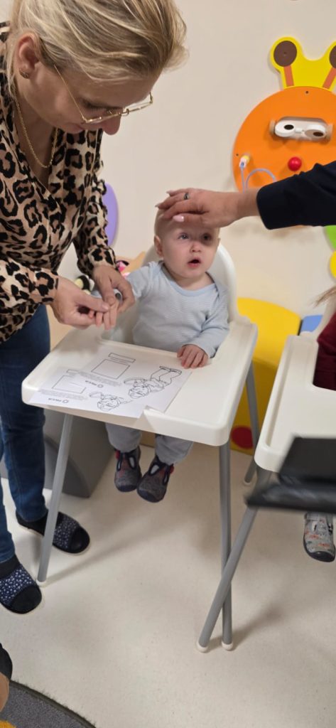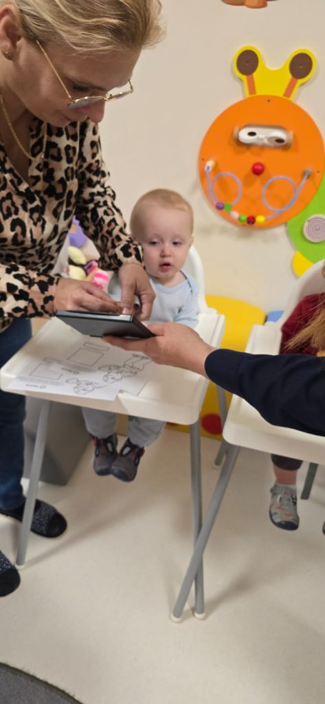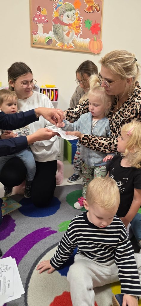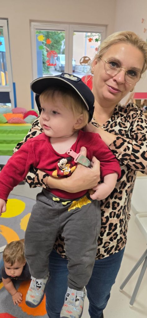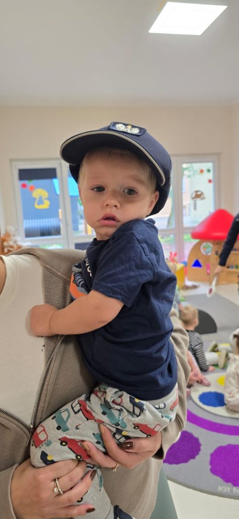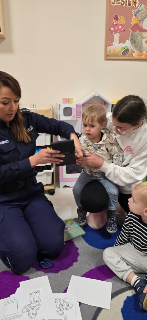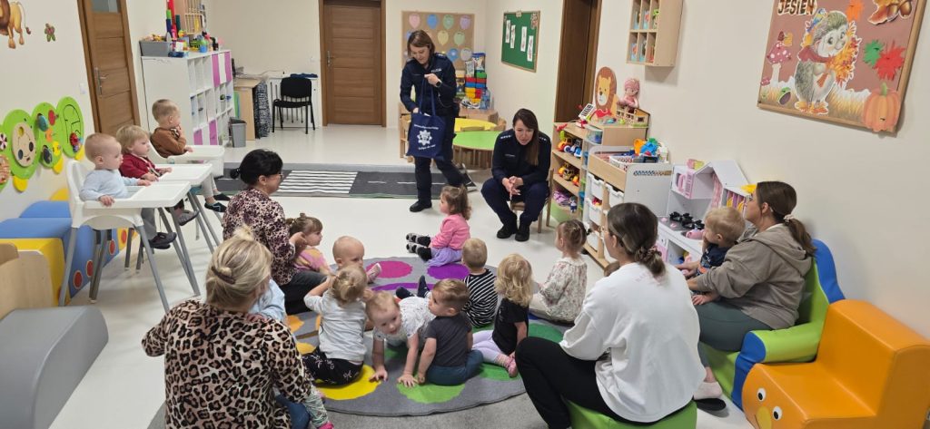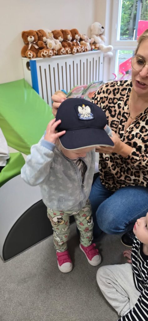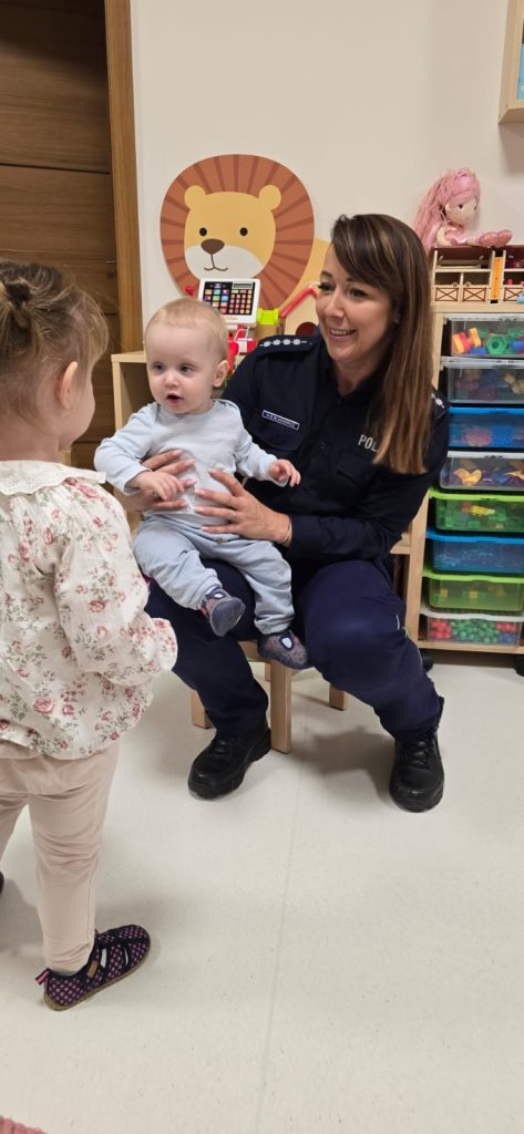 Dziś w naszym żłobku odbyło się spotkanie dzieci z Paniami Policjantkami z Komendy Policji w Aleksandrowie Kujawskim. Celem wizyty było przypomnienie podstawowych zasad bezpieczeństwa, Pani policjantka przybliżyła dzieciom podstawowe zasady bezpiecznego poruszania się po drogach. Jak zwykle dużym zainteresowaniem cieszyła się prezentacja wyposażenia policyjnego, niezbędnego podczas wykonywania pracy policjanta. Na karteczkach każdy z osobna odbił swój odcisk palca. Wspólne zdjęcie było zwieńczeniem tej niecodziennej wizyty.