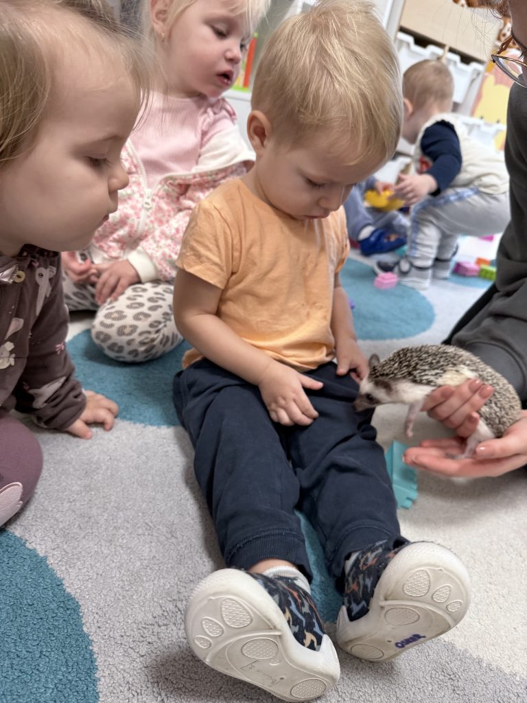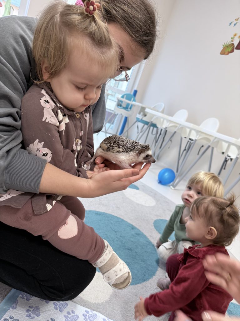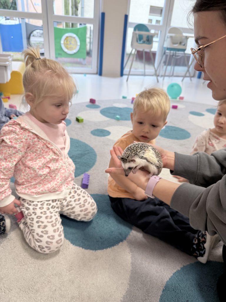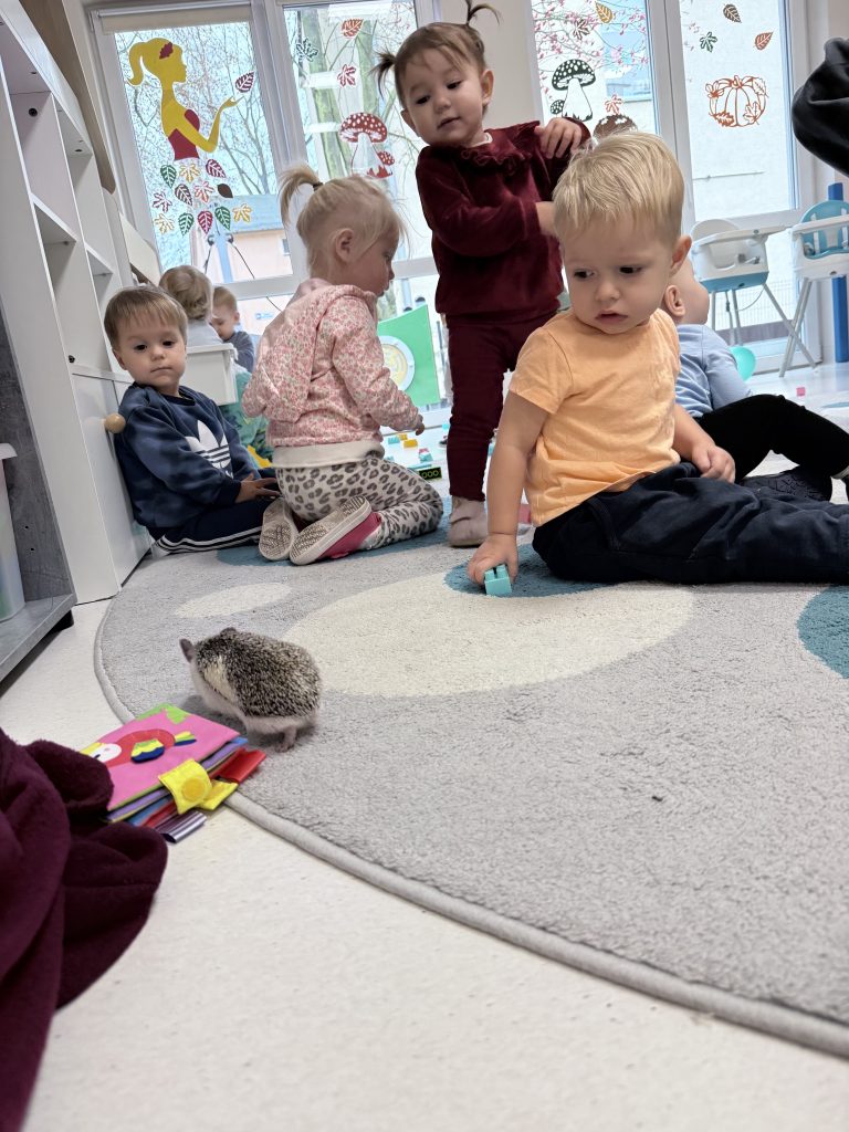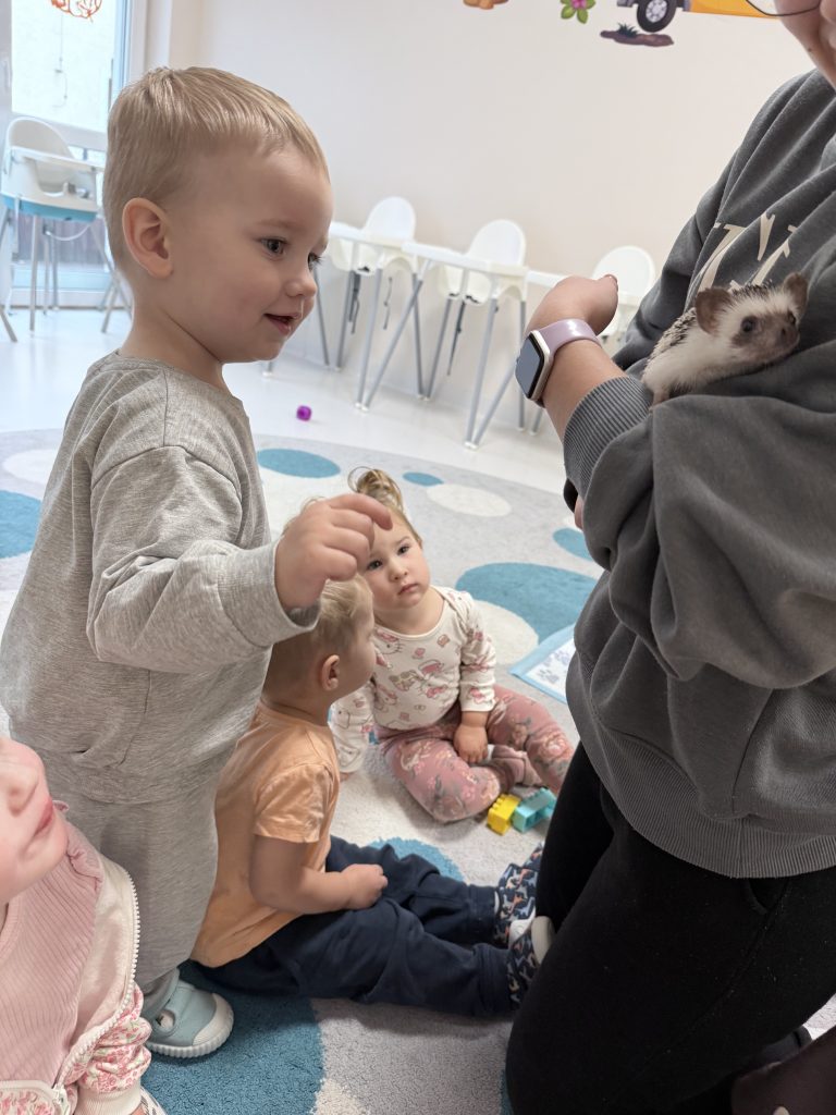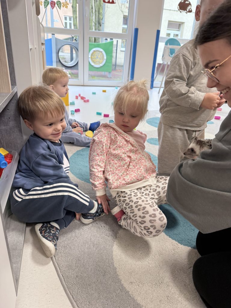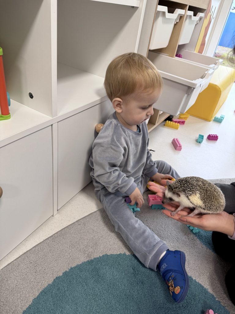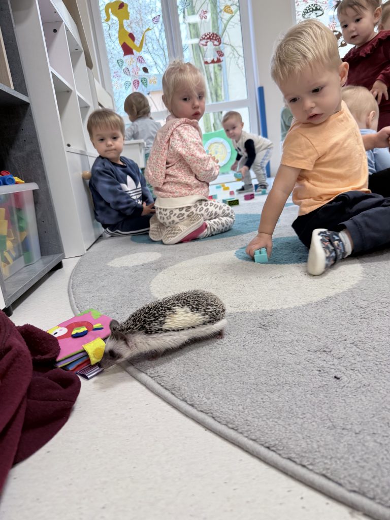 Dnia 17.11.2025r, obchodziliśmy Dzień Jeża, z tej okazji odwiedziła nas Pani Agata z Jeżynką ; ). Tego dnia dzieci miały okazję poznać ich sposób poruszania się. Dzieci zapoznały się z jej wyglądem, dotykały i głaskały, zaciekawione podziwiały małe zwierzątko.