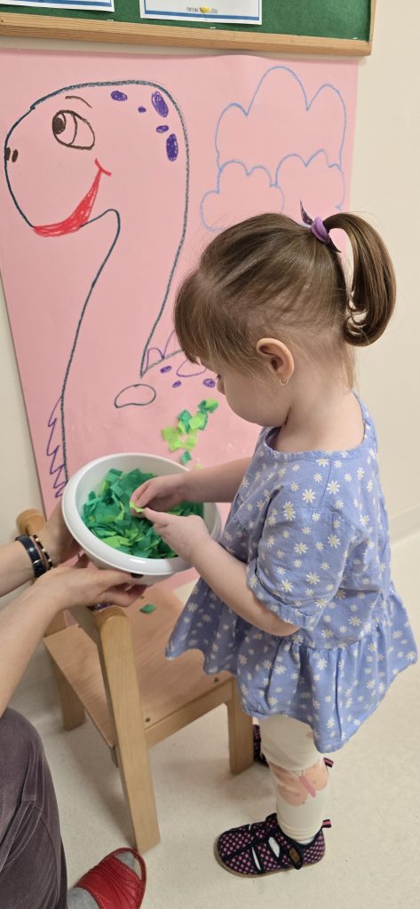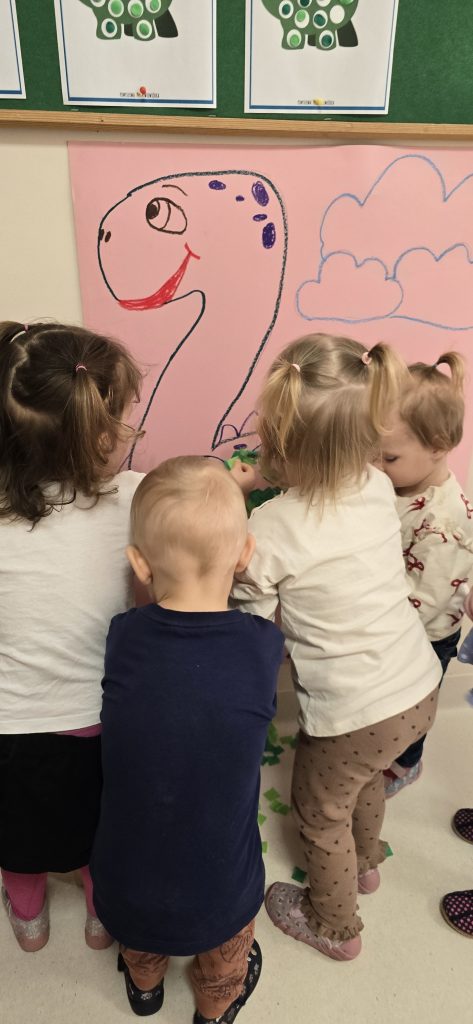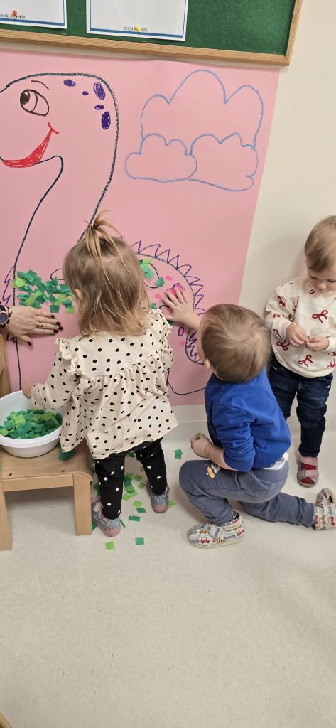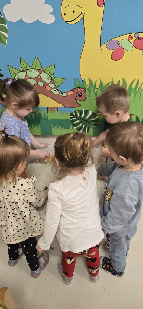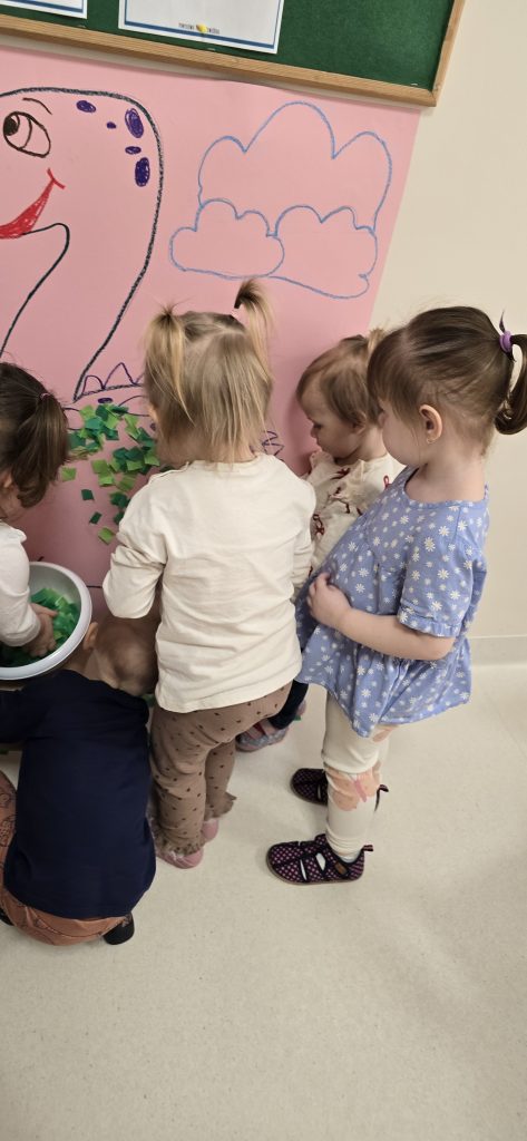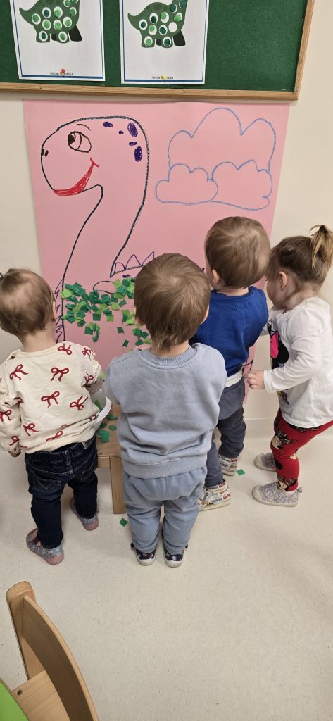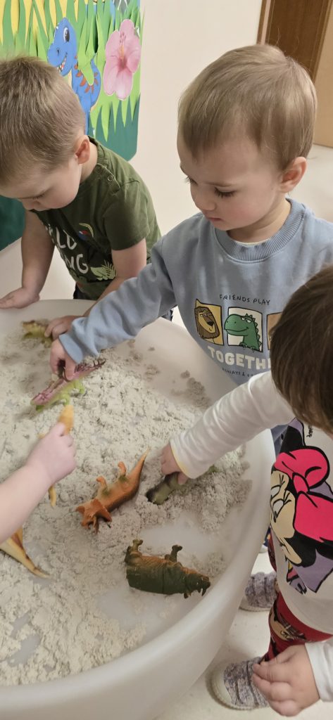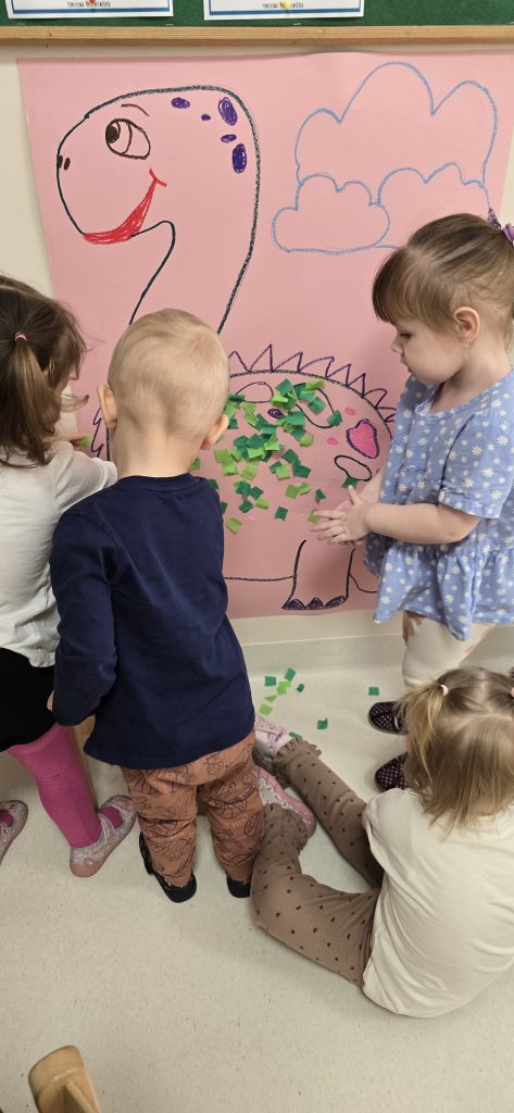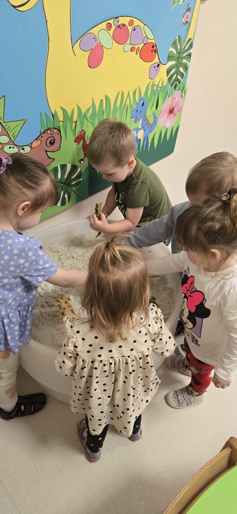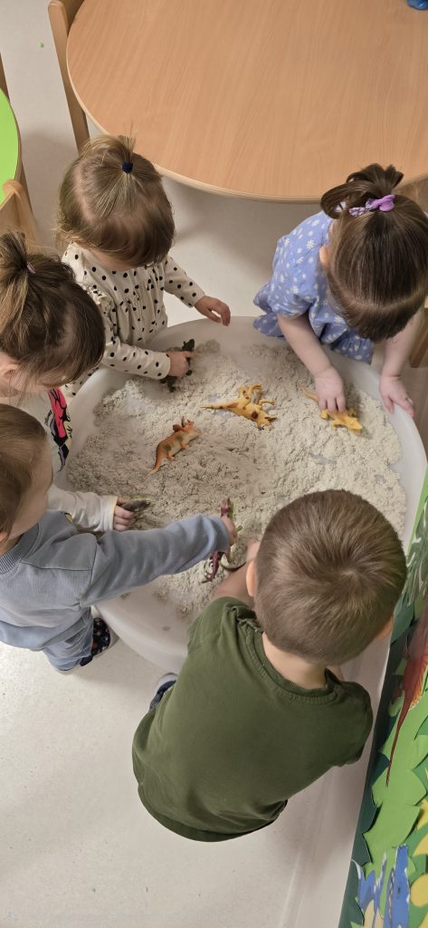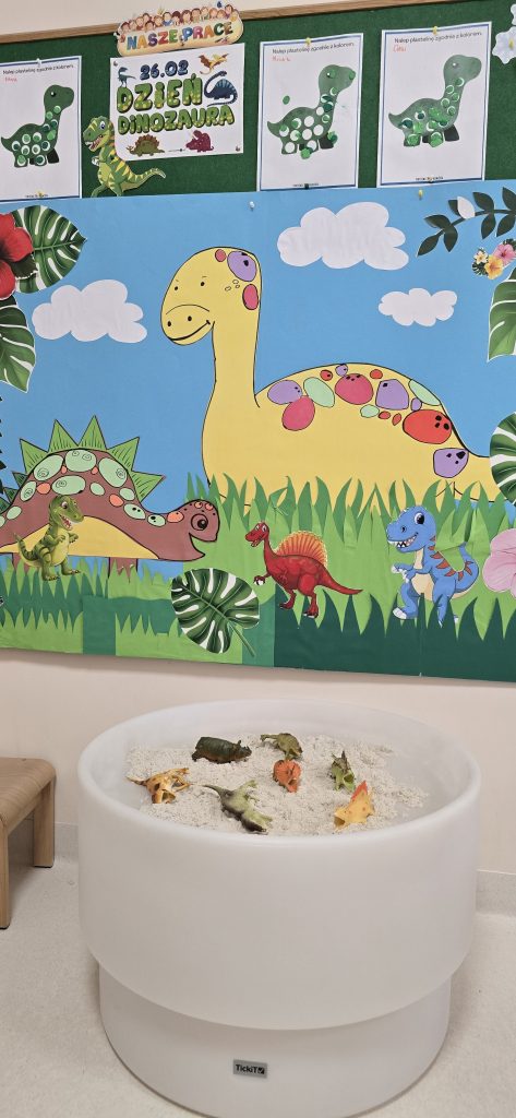 Dzieci wsp贸lnie wykona艂y prac臋 plastyczn膮, ucz膮c si臋 wsp贸艂pracy i kreatywno艣ci. Bawi艂y si臋 r贸wnie偶 piaskiem kinetycznym, tworz膮c prehistoryczne 艣wiaty i 膰wicz膮c motoryk臋 ma艂膮.