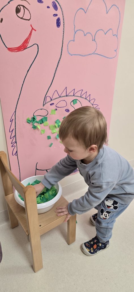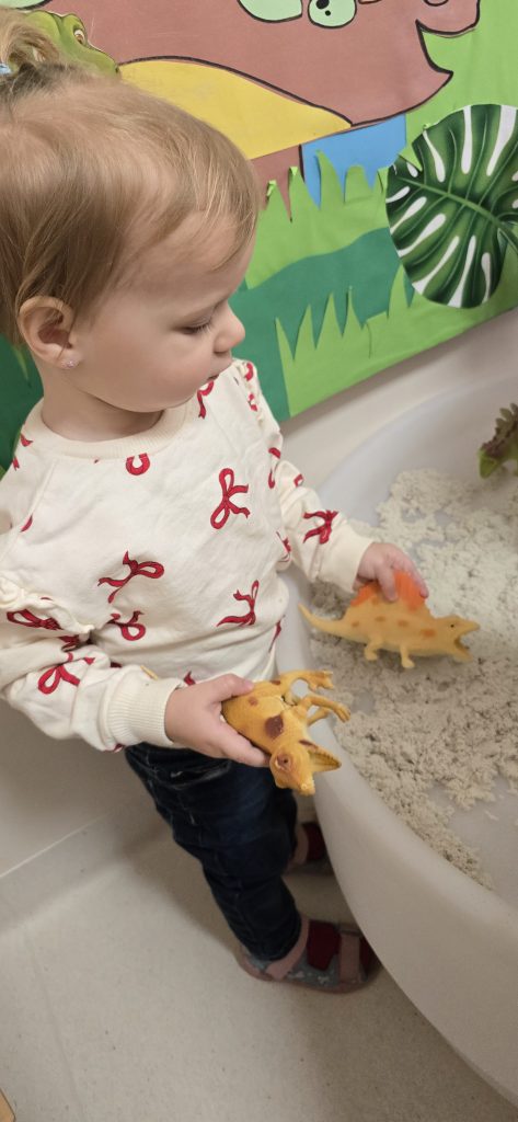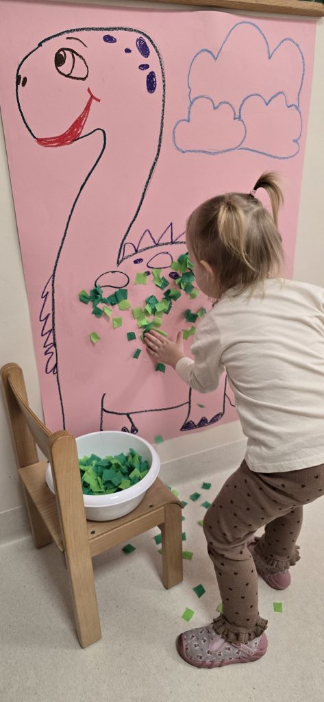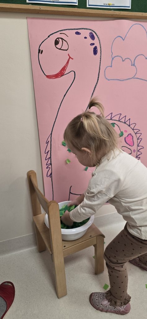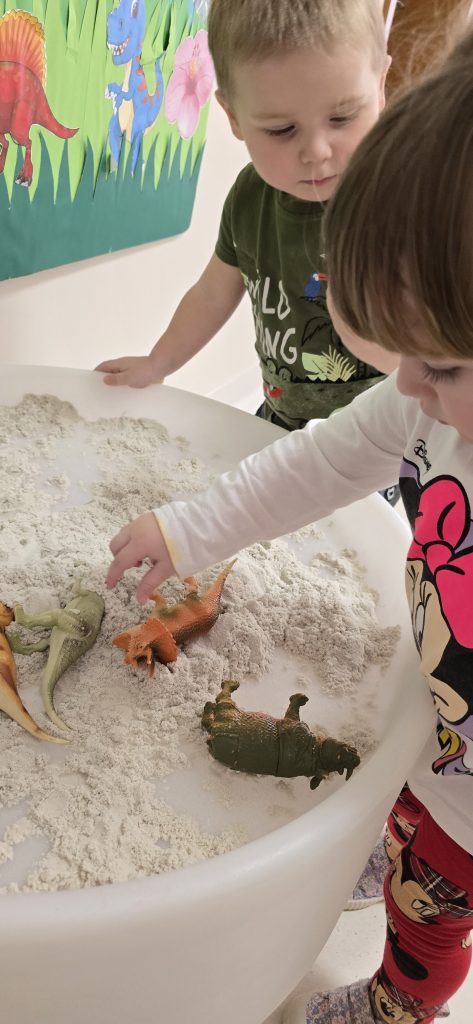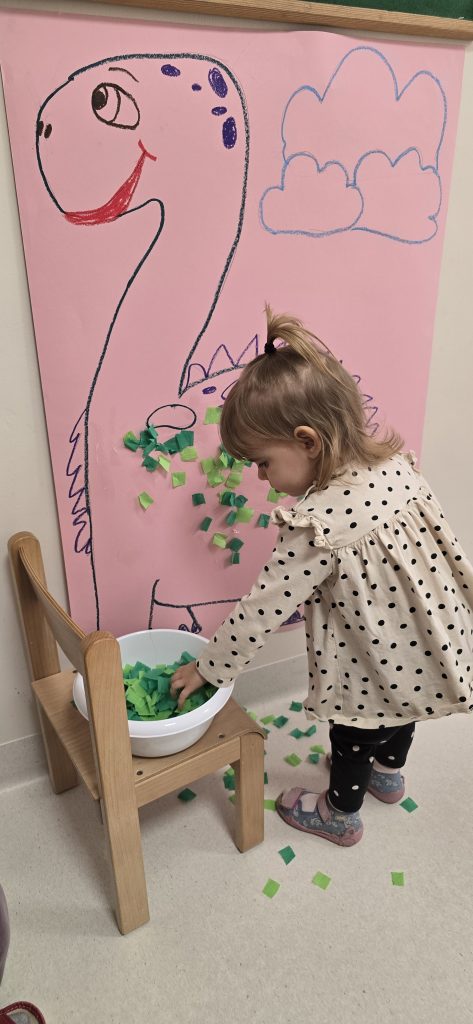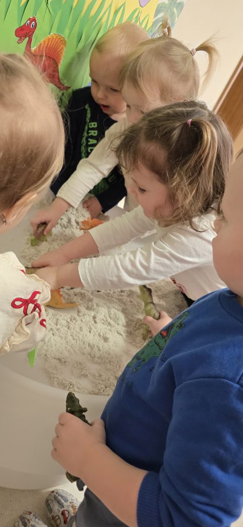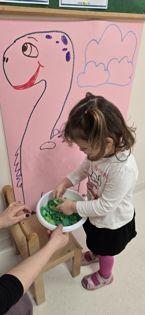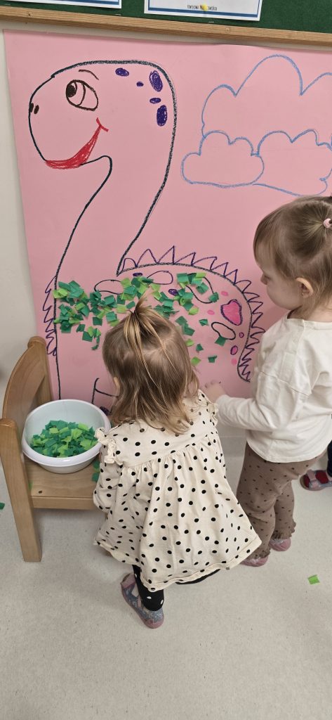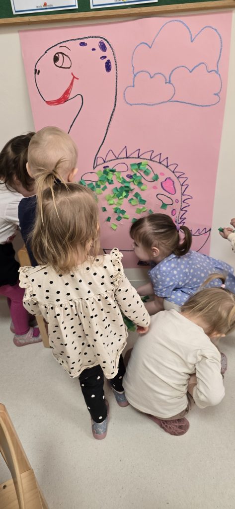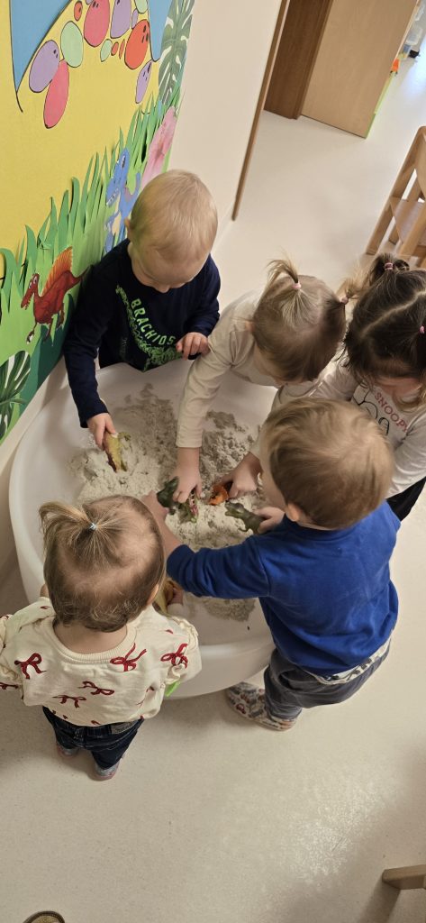 Dzieci wsp贸lnie wykona艂y prac臋 plastyczn膮, ucz膮c si臋 wsp贸艂pracy i kreatywno艣ci. Bawi艂y si臋 r贸wnie偶 piaskiem kinetycznym, tworz膮c prehistoryczne 艣wiaty i 膰wicz膮c motoryk臋 ma艂膮.