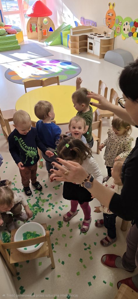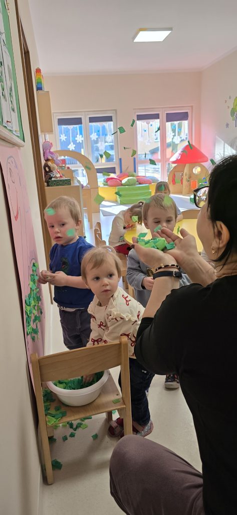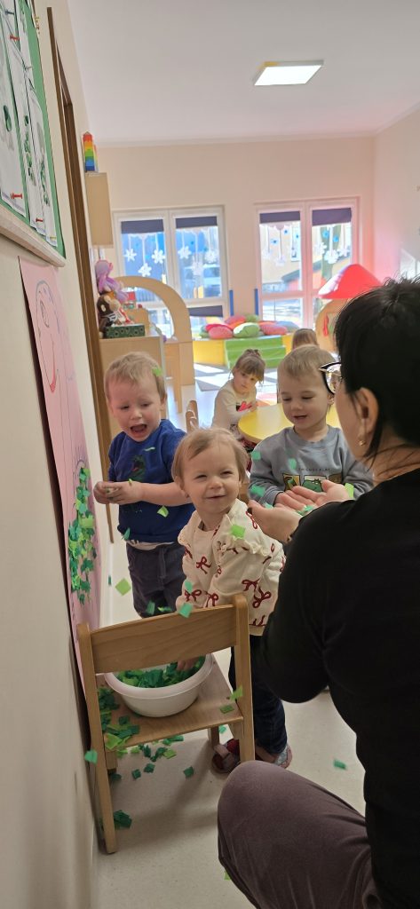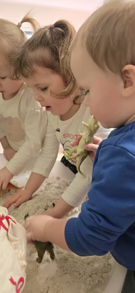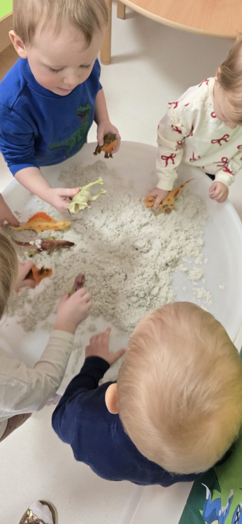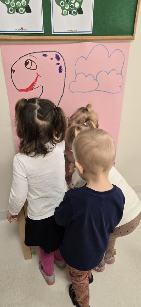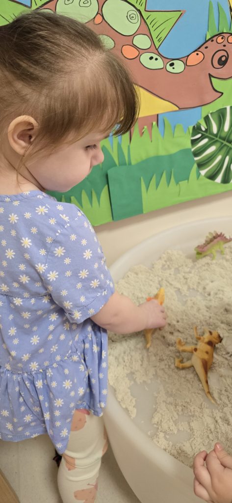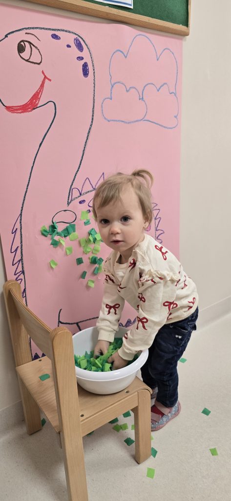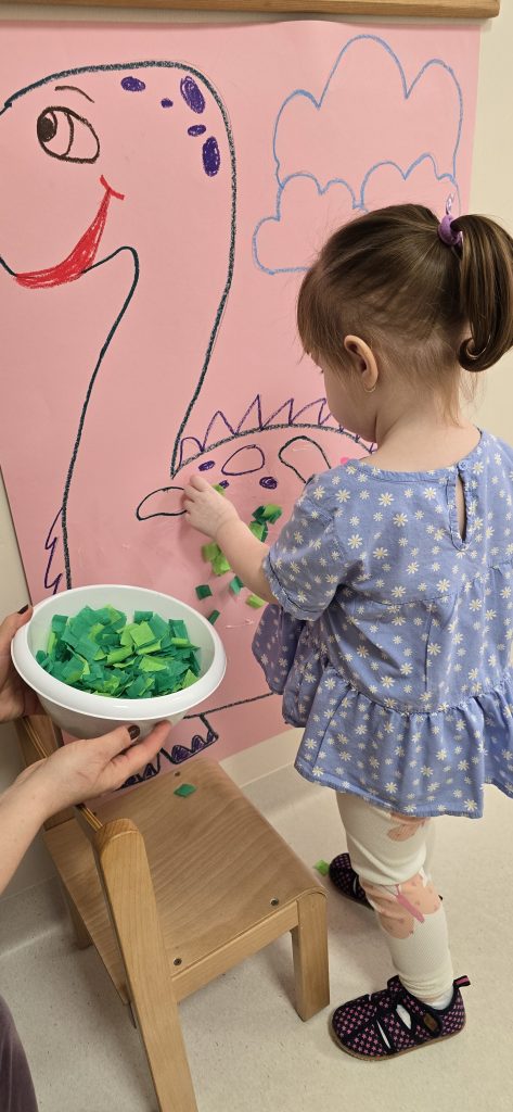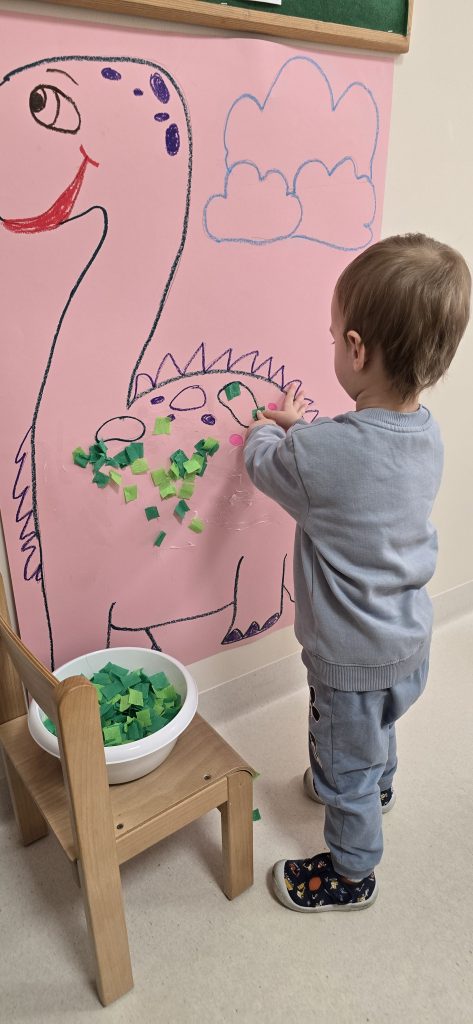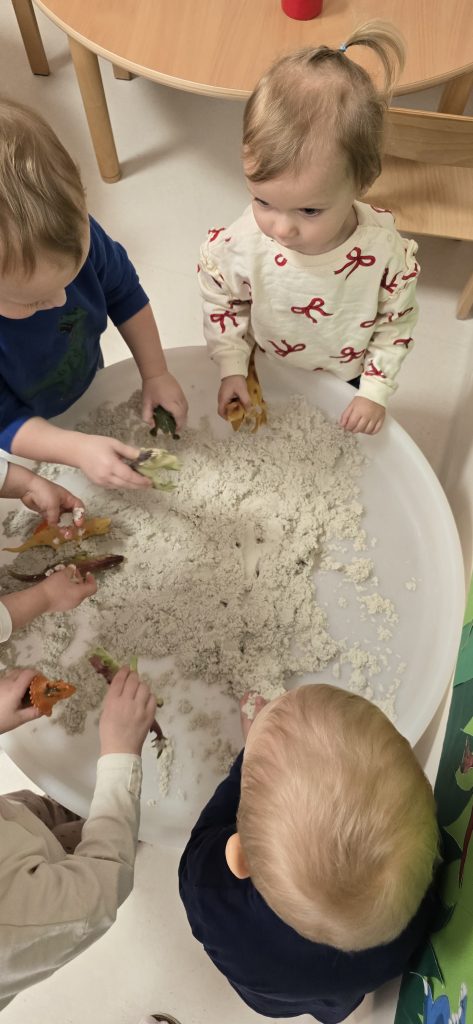 Dzieci wsp贸lnie wykona艂y prac臋 plastyczn膮, ucz膮c si臋 wsp贸艂pracy i kreatywno艣ci. Bawi艂y si臋 r贸wnie偶 piaskiem kinetycznym, tworz膮c prehistoryczne 艣wiaty i 膰wicz膮c motoryk臋 ma艂膮.