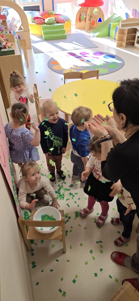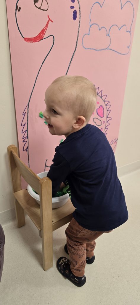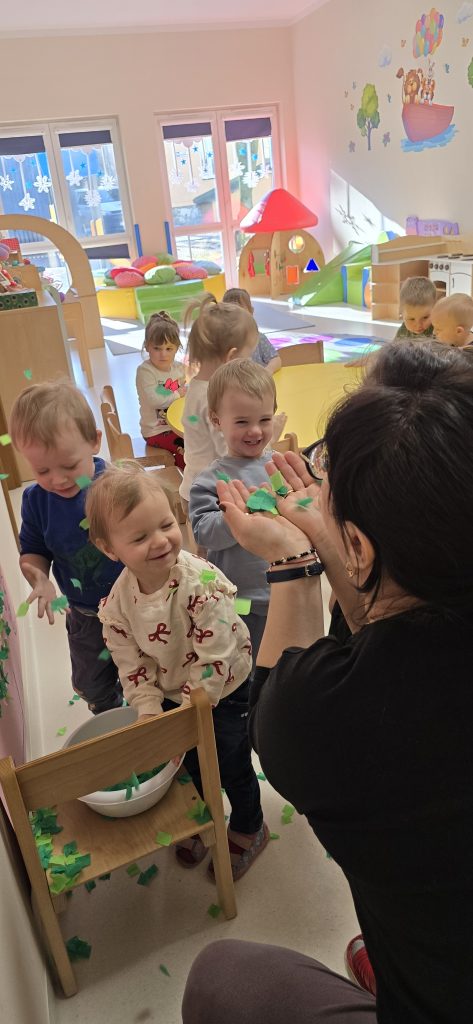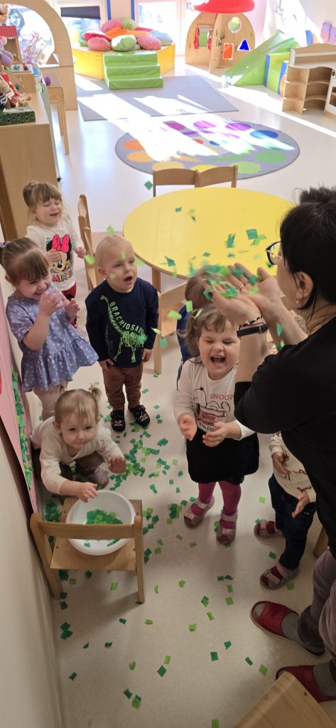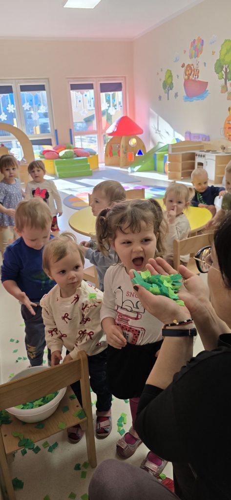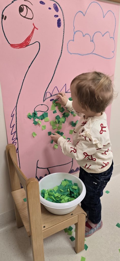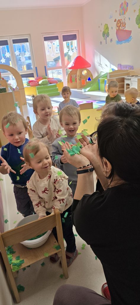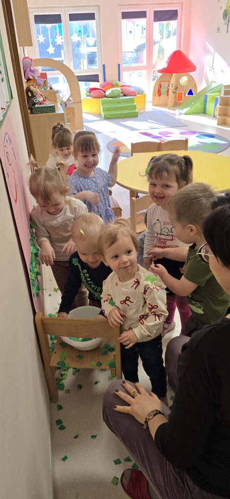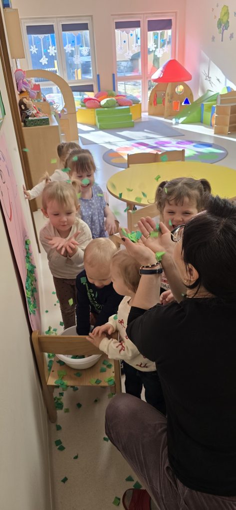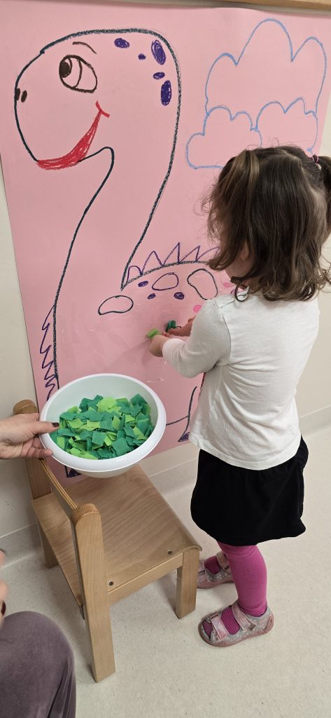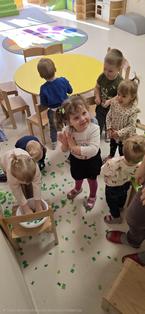 Dzieci wsp贸lnie wykona艂y prac臋 plastyczn膮, ucz膮c si臋 wsp贸艂pracy i kreatywno艣ci. Bawi艂y si臋 r贸wnie偶 piaskiem kinetycznym, tworz膮c prehistoryczne 艣wiaty i 膰wicz膮c motoryk臋 ma艂膮.