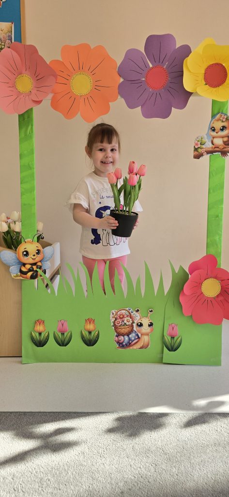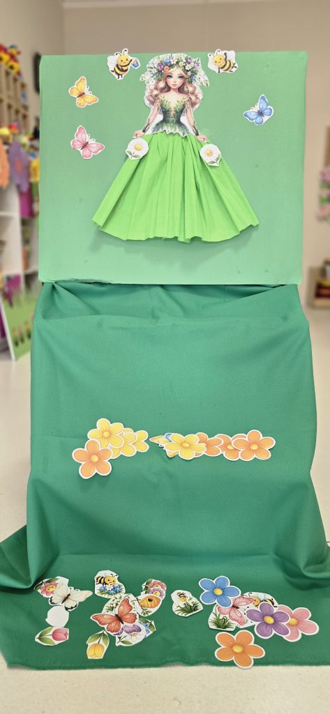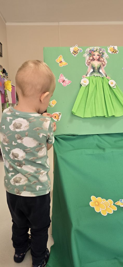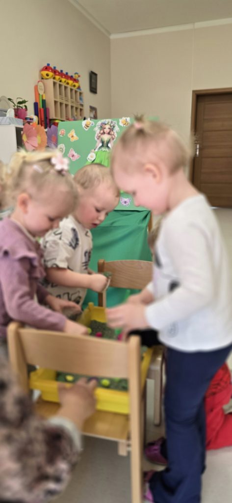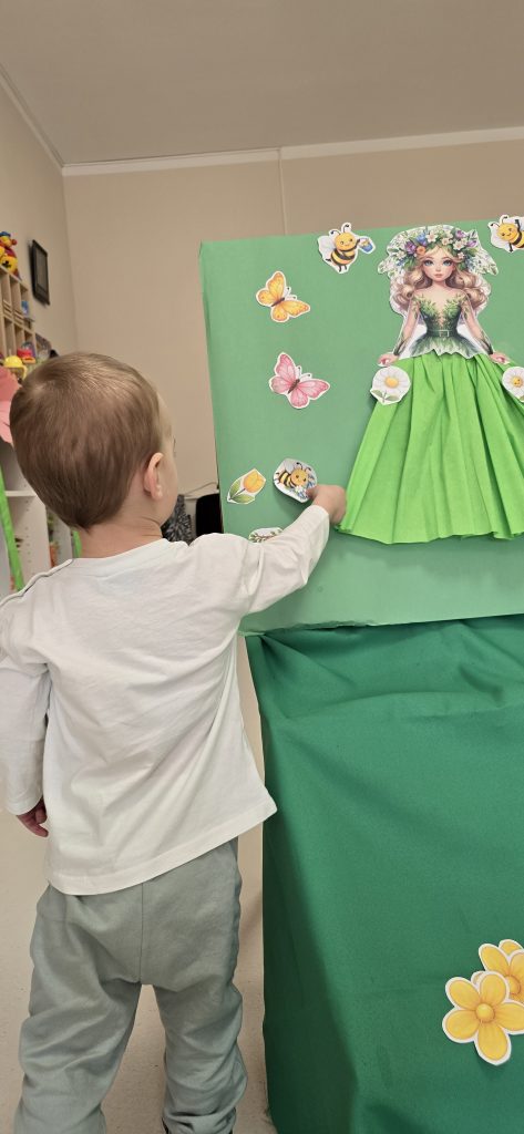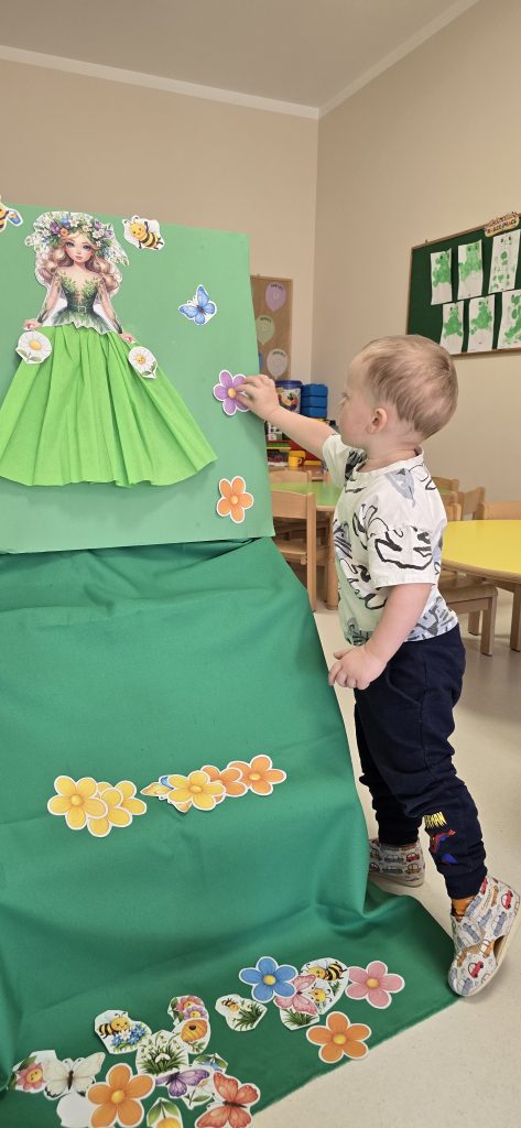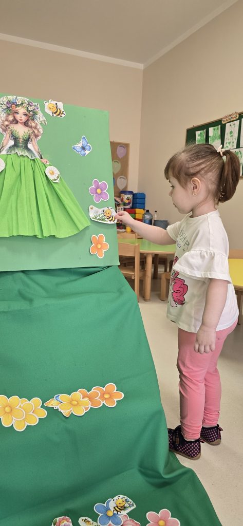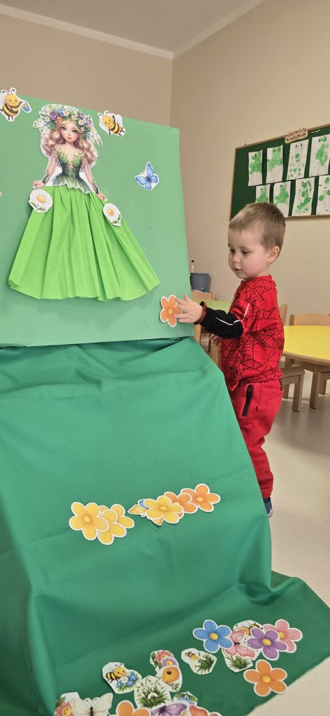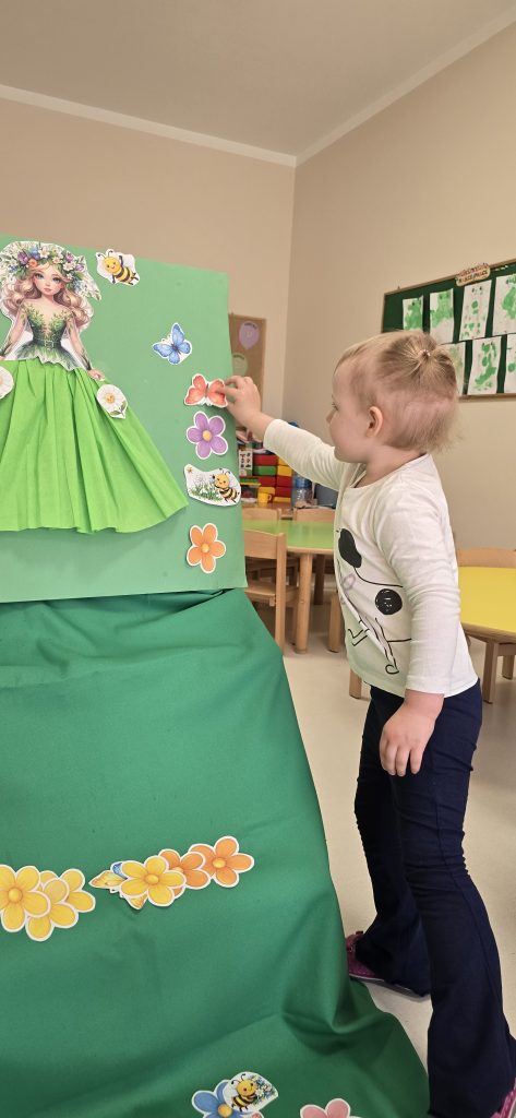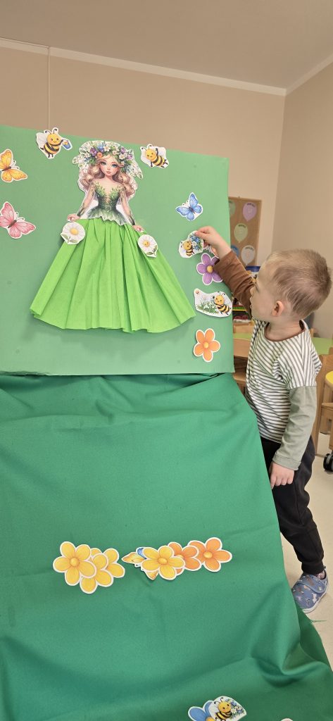 Kolejn膮 aktywno艣ci膮 by艂a zabawa tematyczna zwi膮zana z wiosn膮. Dzieci ozdabia艂y plansz臋 z postaci膮 „Pani Wiosny”, przyklejaj膮c motylki, kwiatki i pszcz贸艂ki. Dzi臋ki temu 膰wiczy艂y koordynacj臋 r臋ka-oko oraz uczy艂y si臋 rozpoznawania element贸w przyrody.