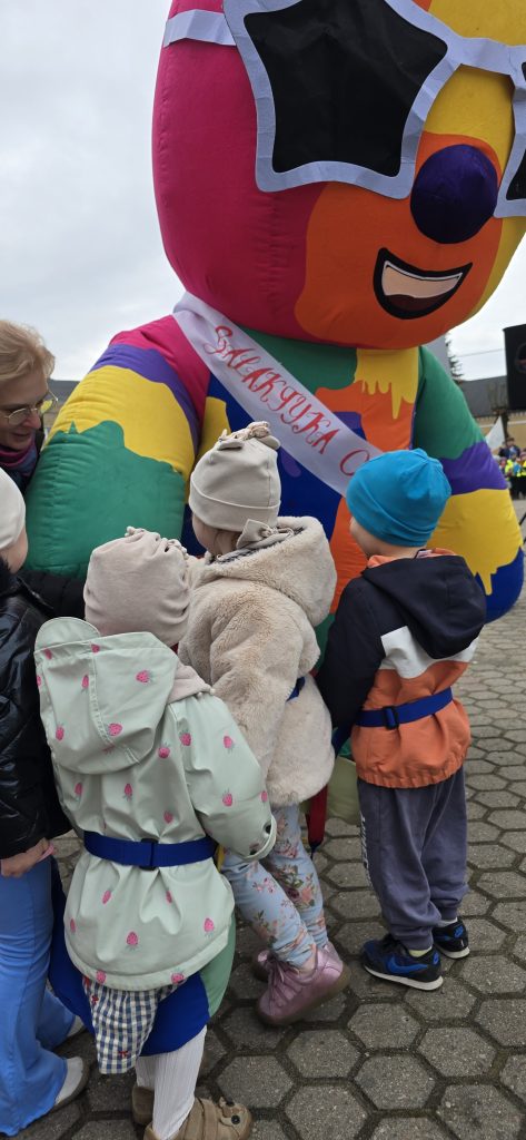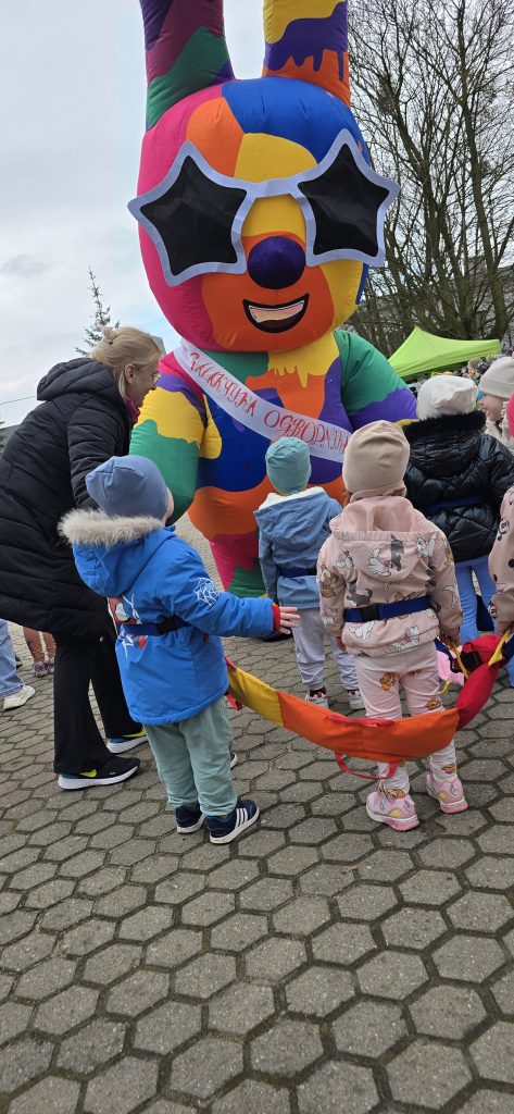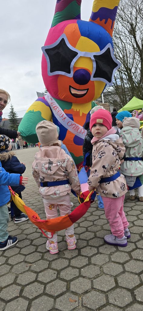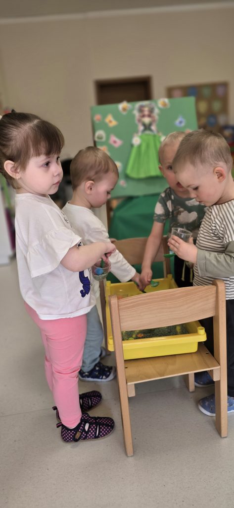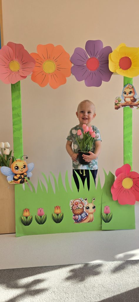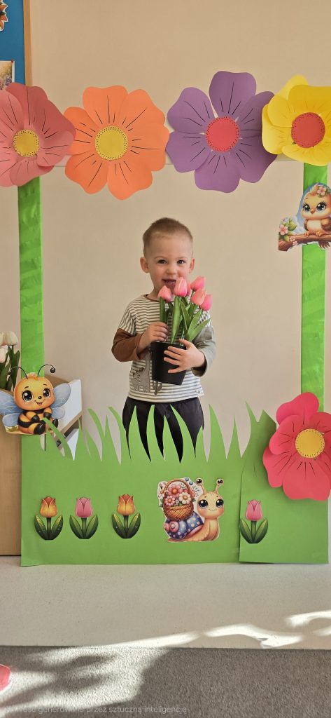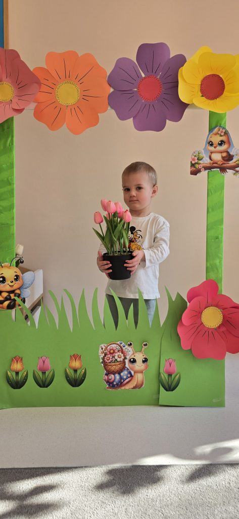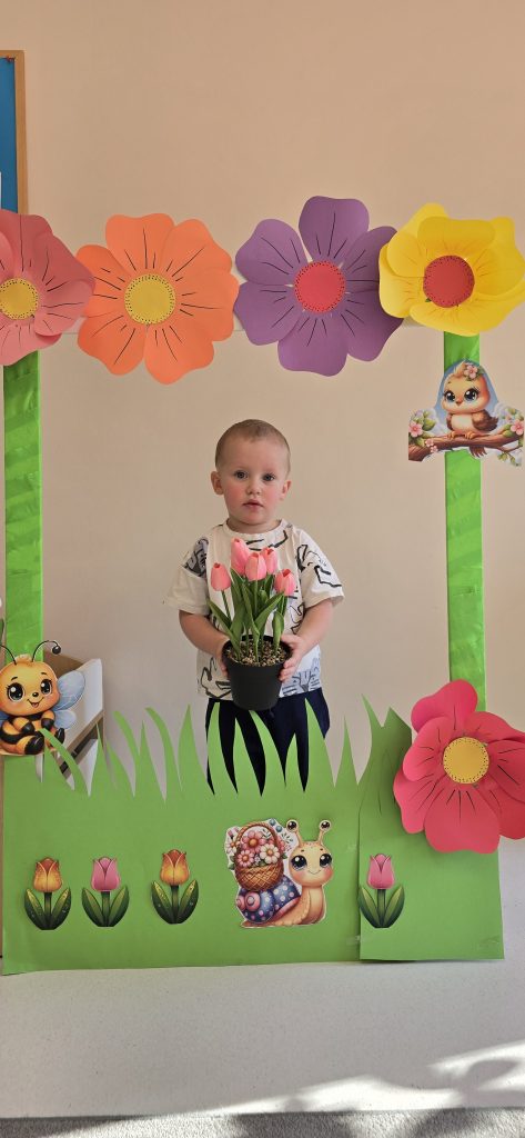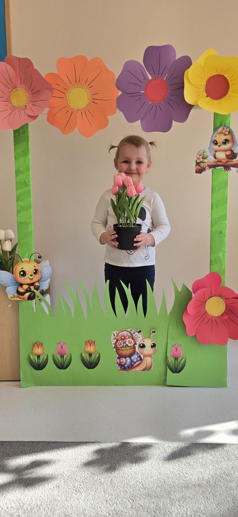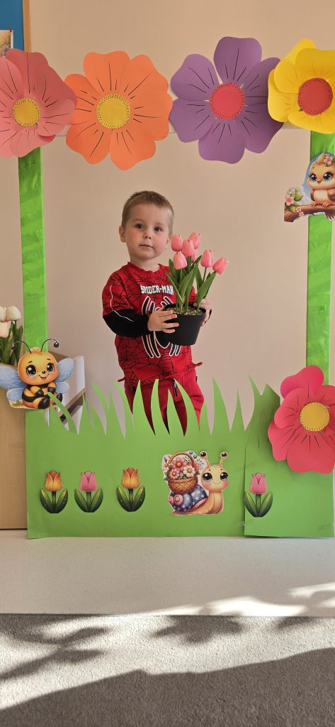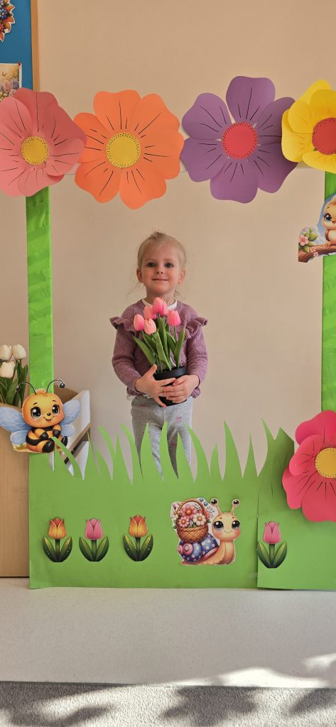 Kolejn膮 aktywno艣ci膮 by艂a zabawa tematyczna zwi膮zana z wiosn膮. Dzieci ozdabia艂y plansz臋 z postaci膮 „Pani Wiosny”, przyklejaj膮c motylki, kwiatki i pszcz贸艂ki. Dzi臋ki temu 膰wiczy艂y koordynacj臋 r臋ka-oko oraz uczy艂y si臋 rozpoznawania element贸w przyrody.