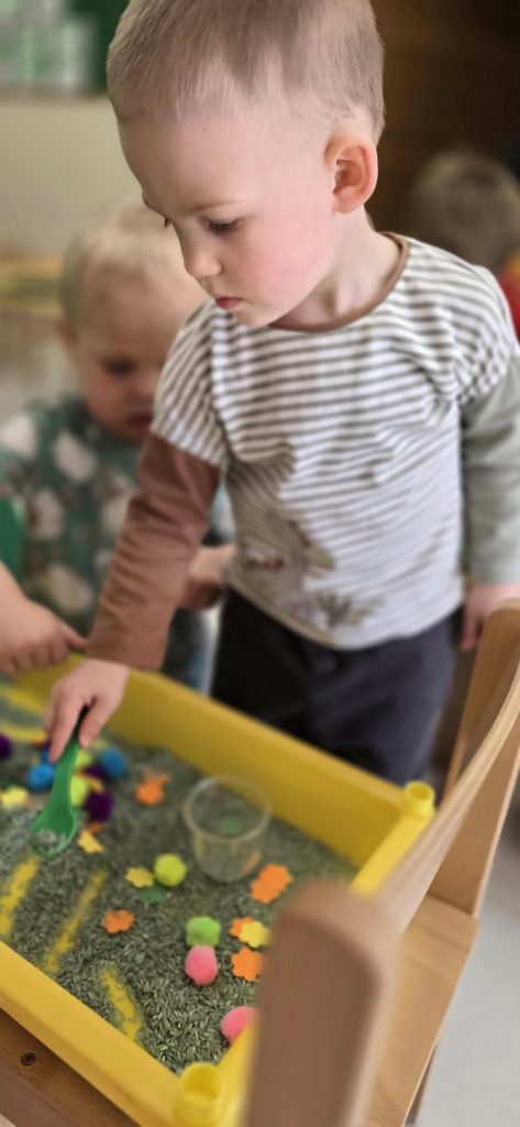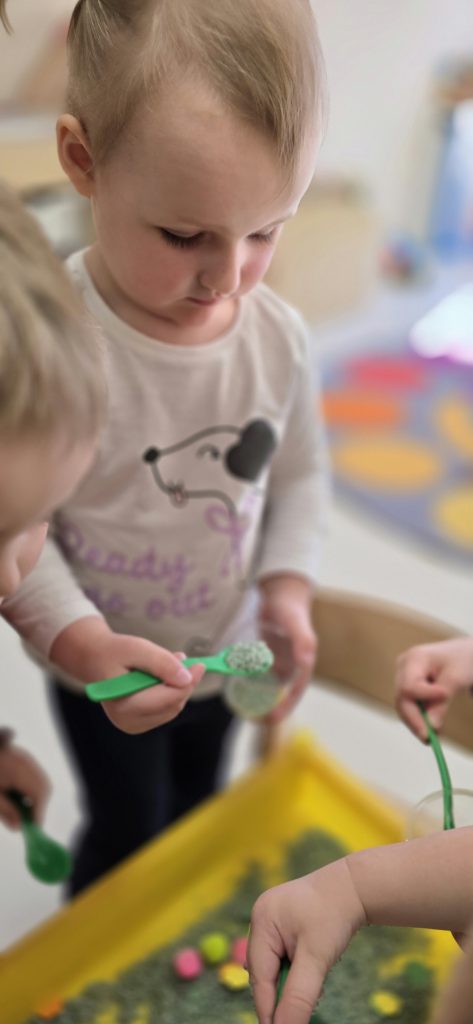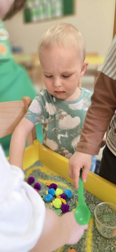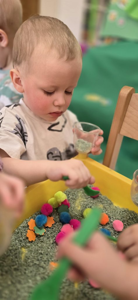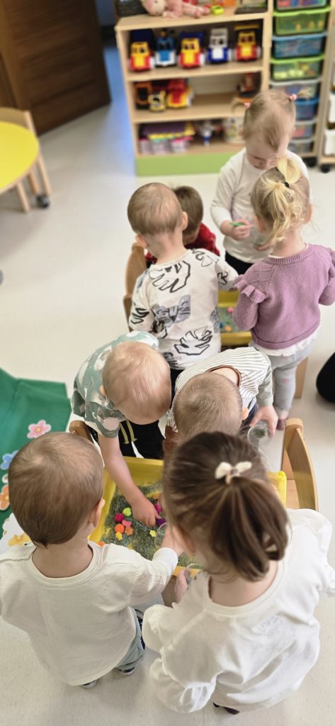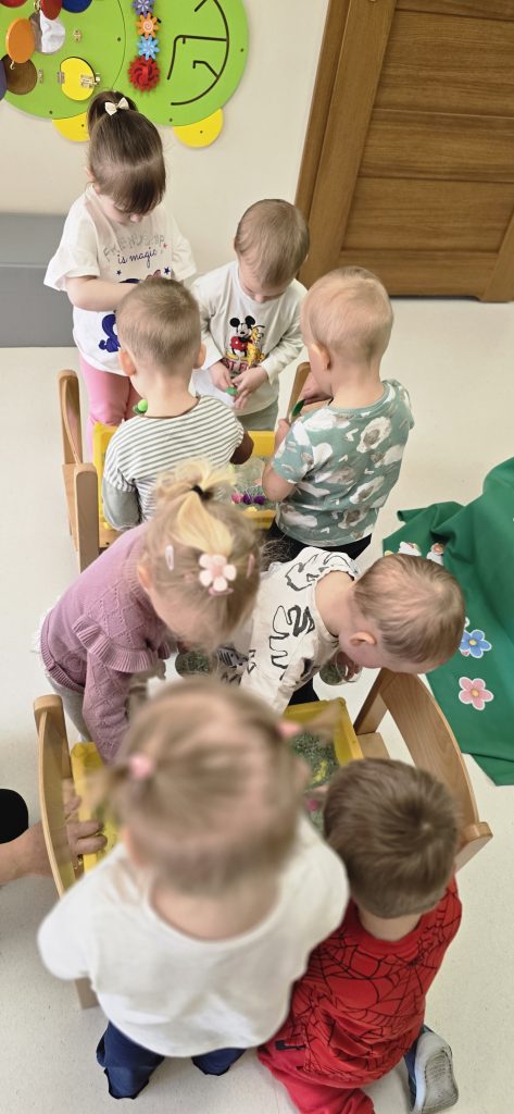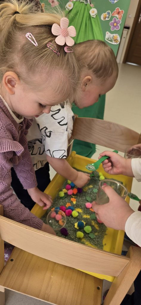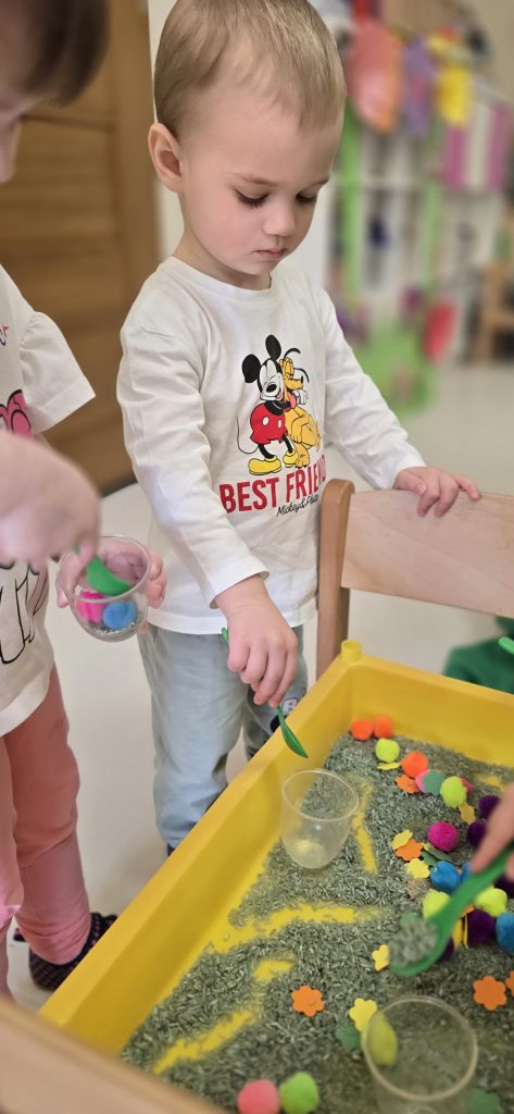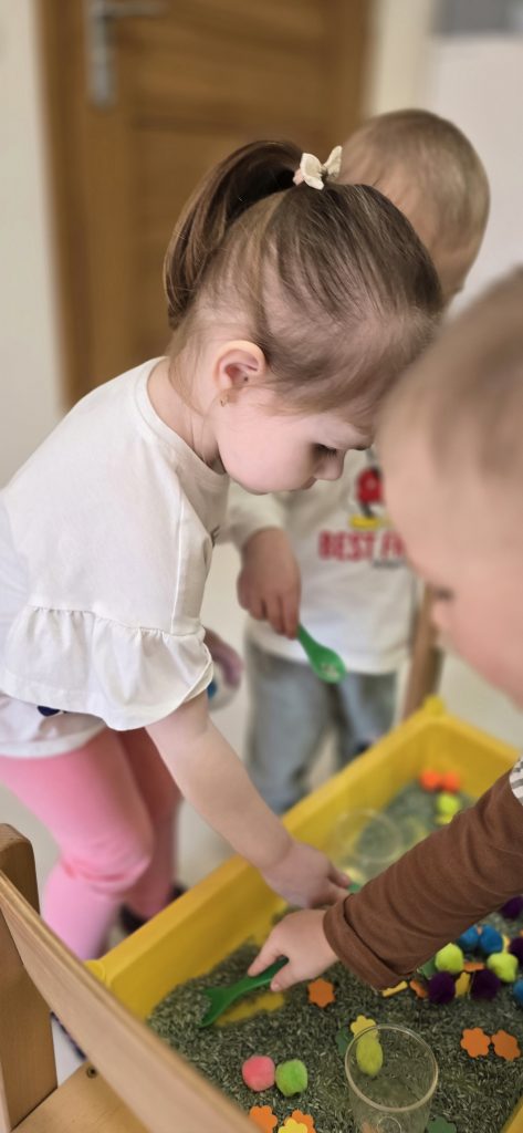 Tygryski uczestniczy艂y w zabawach sensorycznych, podczas kt贸rych wsp贸lnie bawi艂y si臋 ry偶em, pomponami i innymi elementami, rozwijaj膮c przy tym motoryk臋 ma艂膮 oraz kreatywno艣膰.